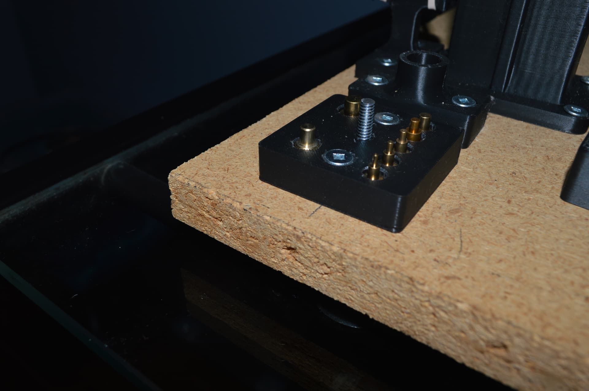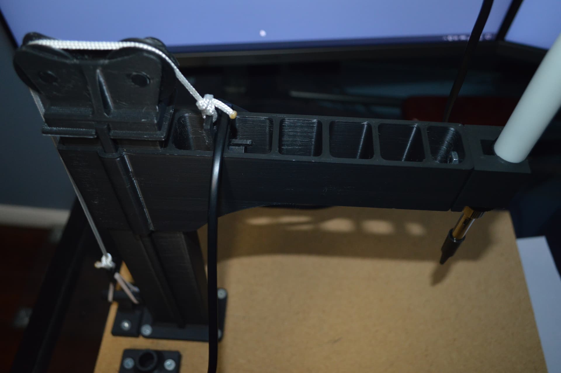 This is the stand I made for inserting threaded inserts. There are dozens of these available on Thingaverse, Printables etc. so why make another. All the ones you can download require parts like extruded frames, wheels, bearings etc. All this needs , besides the printed parts, is some cord, and elastic band an a few nuts and bolts. Naturally it also needs a soldering iron with the insert bits.