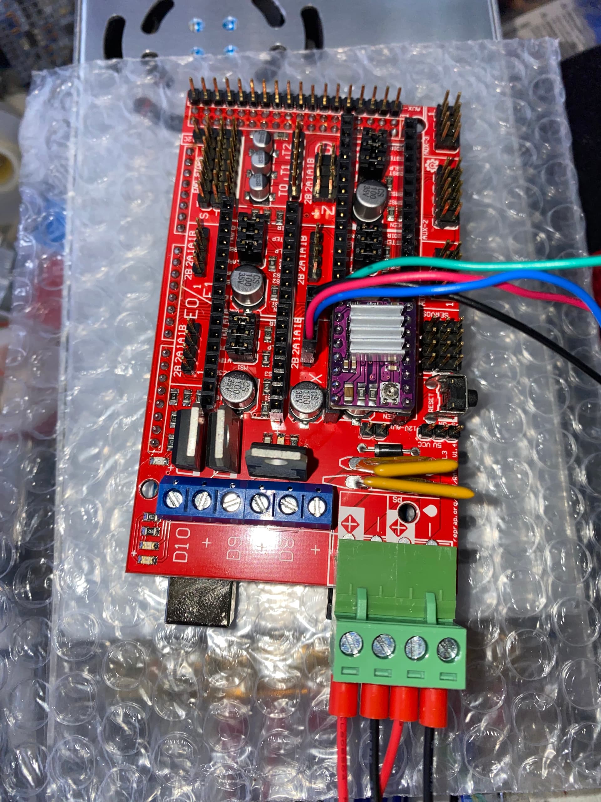 My daughter has a school project in which she needed a continually rotating motor. I thought that since I have a ton of old 3D printer parts, I’d throw something together with an old 12V power supply, a RAMPS/Arduino Mega and DRV8825.