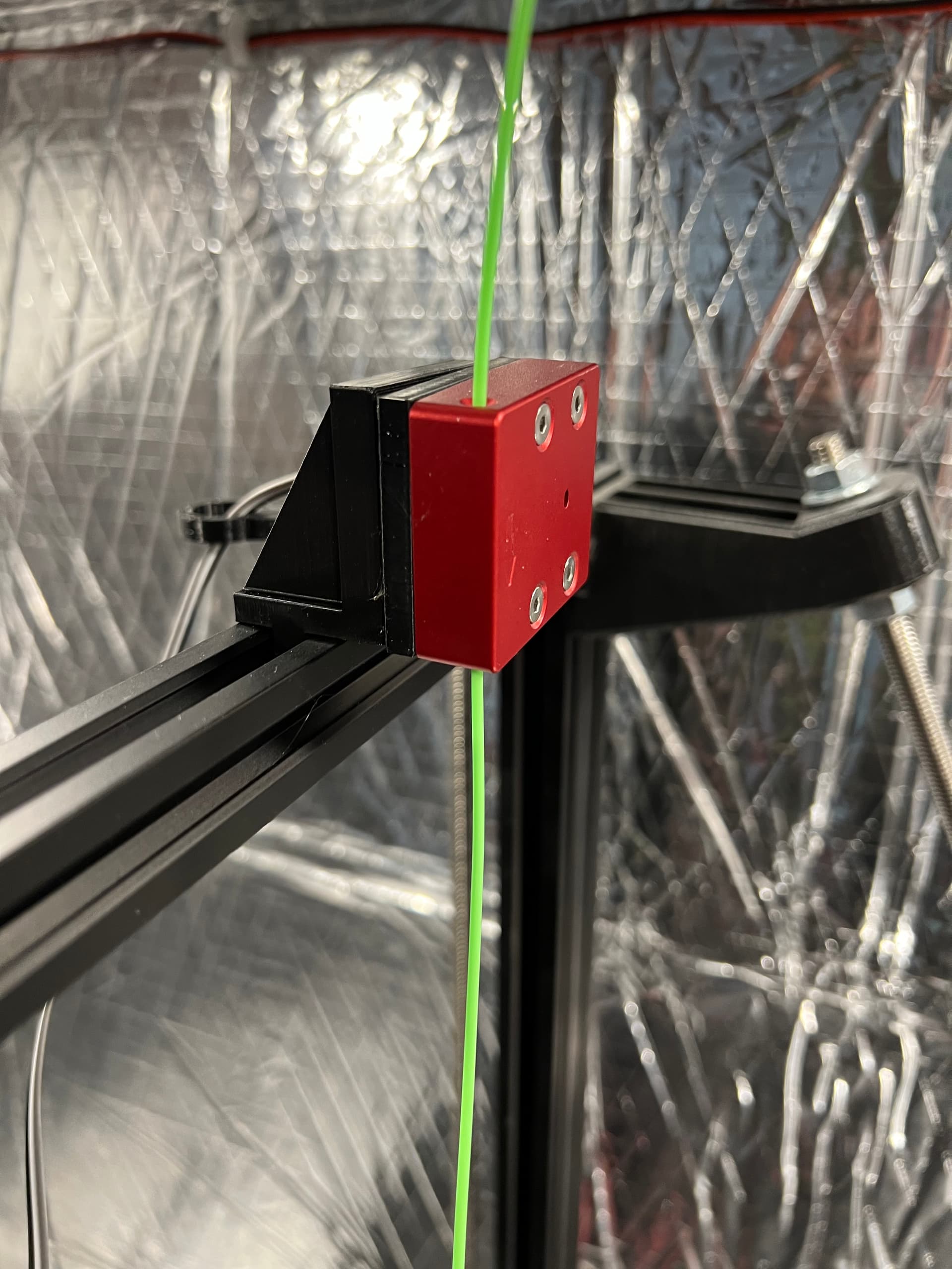 I’ve also relocated the filament runout sensor to the top frame since the filament is fed from the top down and i was having problems with tension on the filament from running it over to the side and through the Bowden tube to the direct drive extruder. Removing all that is much nicer. I found a mount on thingiverse that rotates on a bearing so as the extruder travels along the x axis the filament doesn’t catch.