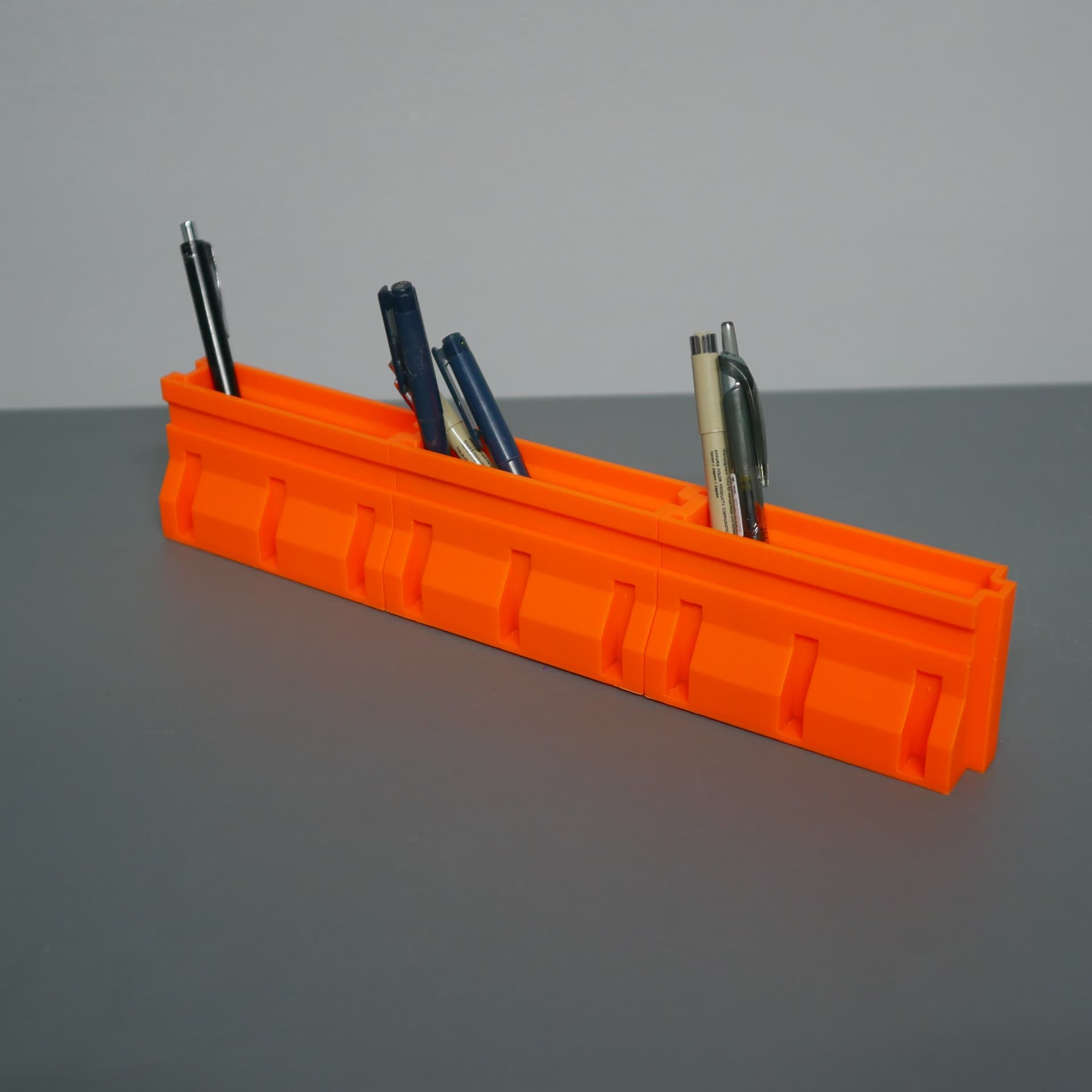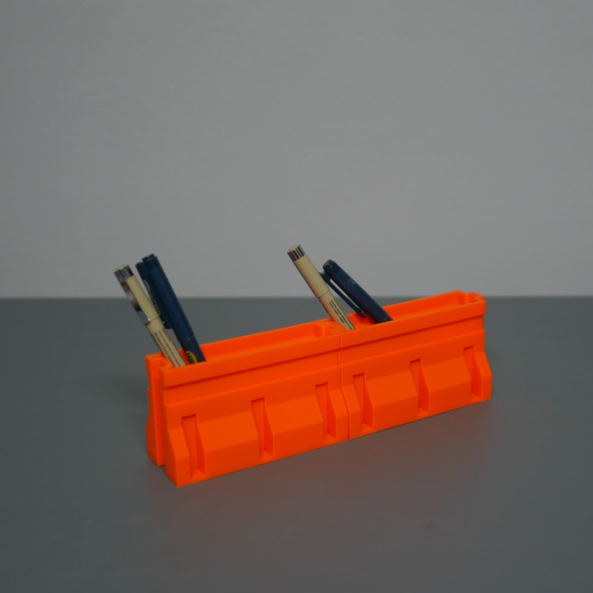 Here some pics of the Road Barrier Pen Holder I printed a couple weeks ago and it still slaps on my desk. I ran it in basic PLA but honestly this would go hard in matte black, or even a silk filament if you want it to pop. Lowkey one of those prints that looks simple but levels up your setup big time.